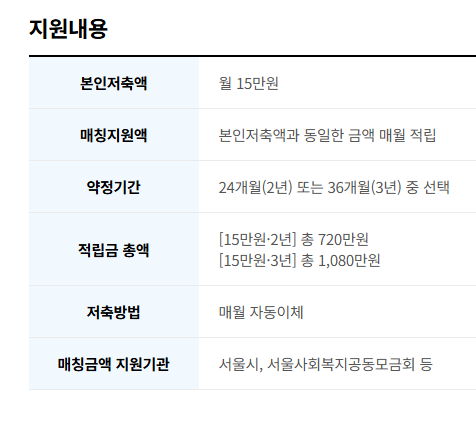 3년간 매달 15만 원 저축 시, 총 540만 원의 서울시 지원금 + 이자를 더해 최대 1,080만 원 수령 가능!