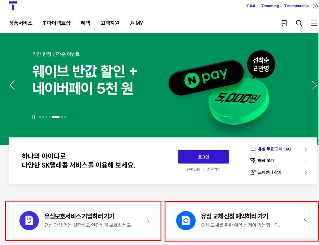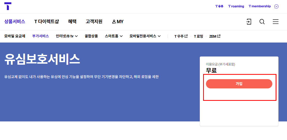 1. T월드 앱 / 웹 접속 → 유심보호서비스 가입하러 가기 클릭