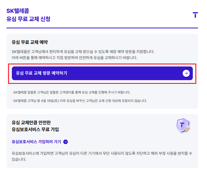 1. T월드 앱 / 웹 접속 → 유심 교체 신청 예약하러 가기 클릭