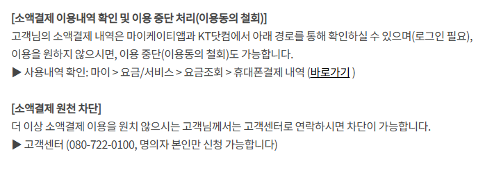 - KT 소액결제 해지 및 차단만으로도 피해를 충분히 예방할 수 있습니다.