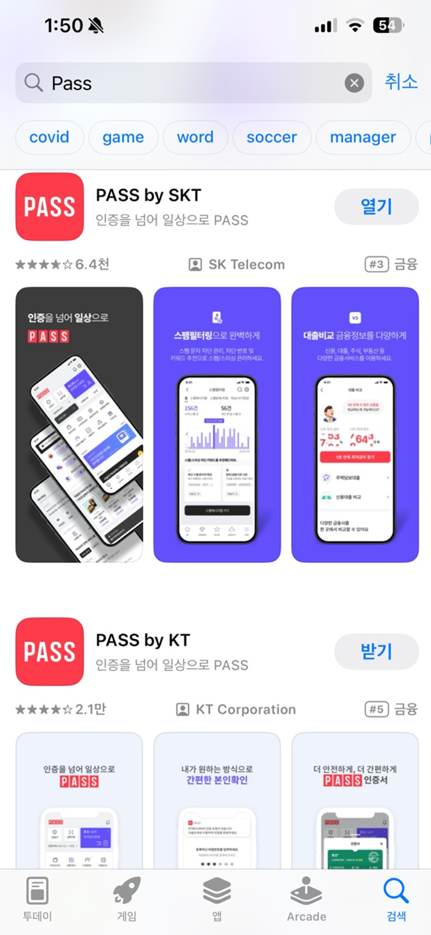 - 앱스토어에서 'PASS' 앱 검색 후 설치