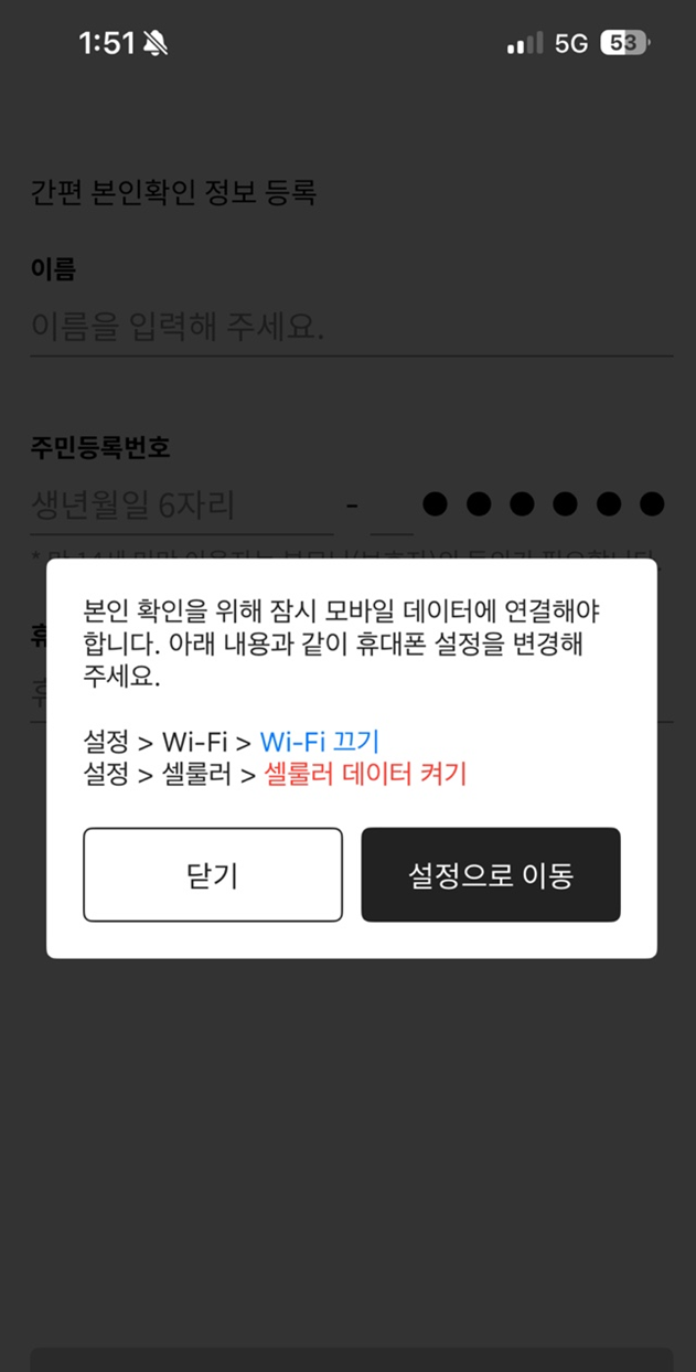 - 와이파이끄고 셀룰러 데이터(모바일 데이터) 켜서 진행해야 합니다.