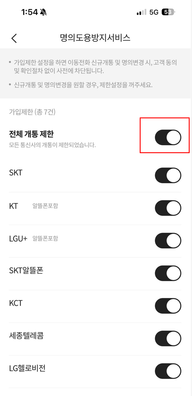 💡 차단 설정 후에는 통신사 대리점에서도 휴대폰 개통이 불가능합니다.