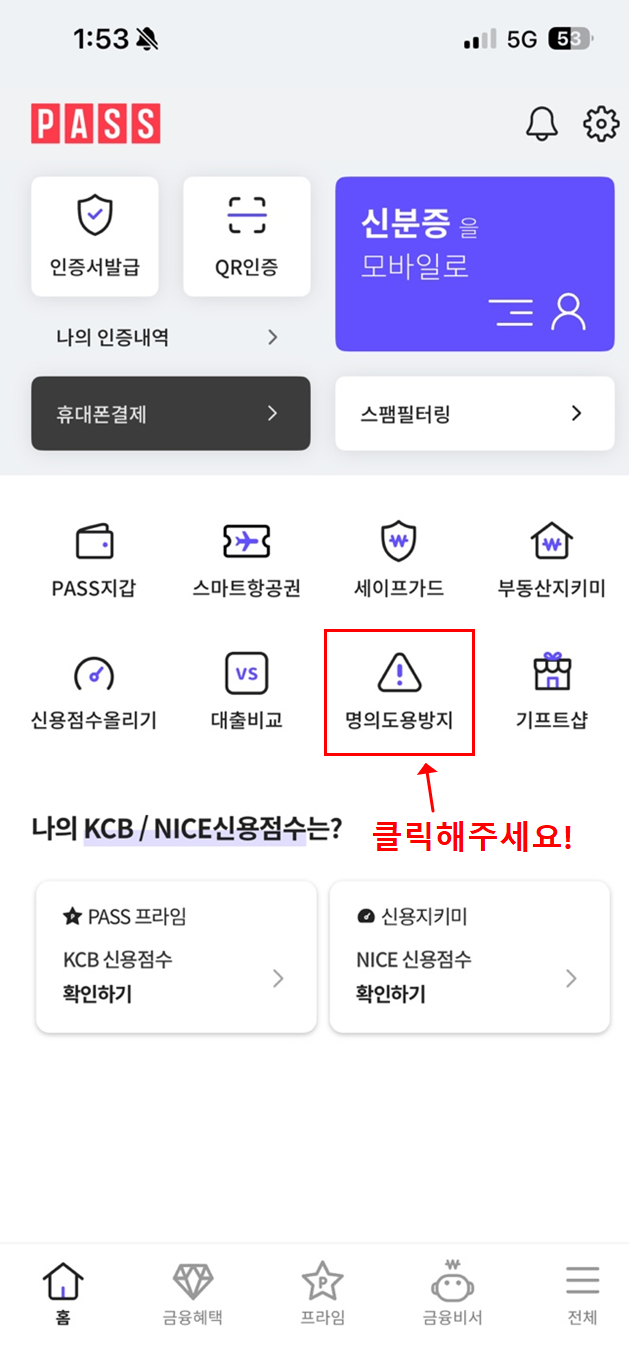 지금 바로 PASS 앱을 열고 명의도용 차단을 설정해보세요!