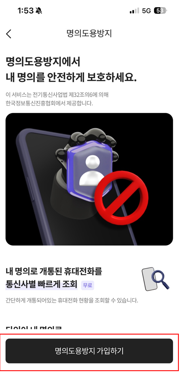 - 본인 명의로 휴대폰 개통 시도 시 자동 차단